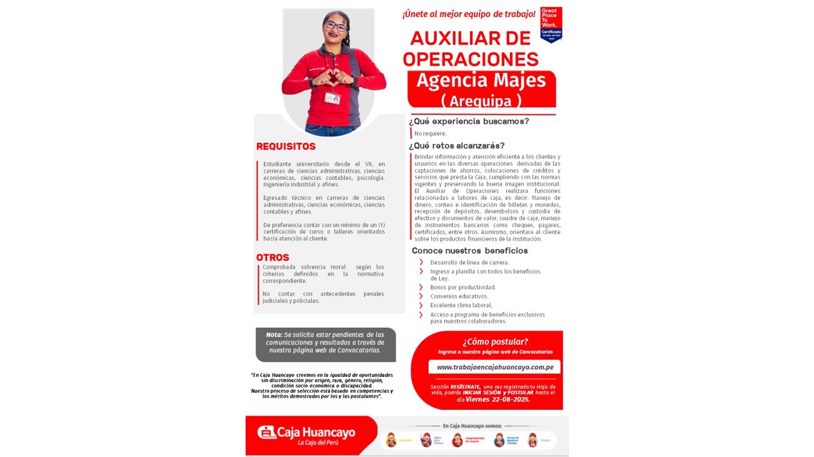 Caja Huancayo, una de las instituciones financieras más reconocidas y sólidas del país, se encuentra en búsqueda de un Auxiliar de Operaciones para nuestra Agencia de Majes. Si eres una persona proactiva, orientada al servicio al cliente y con habilidades de comunicación y persuasión, ¡Esta oportunidad es para ti!