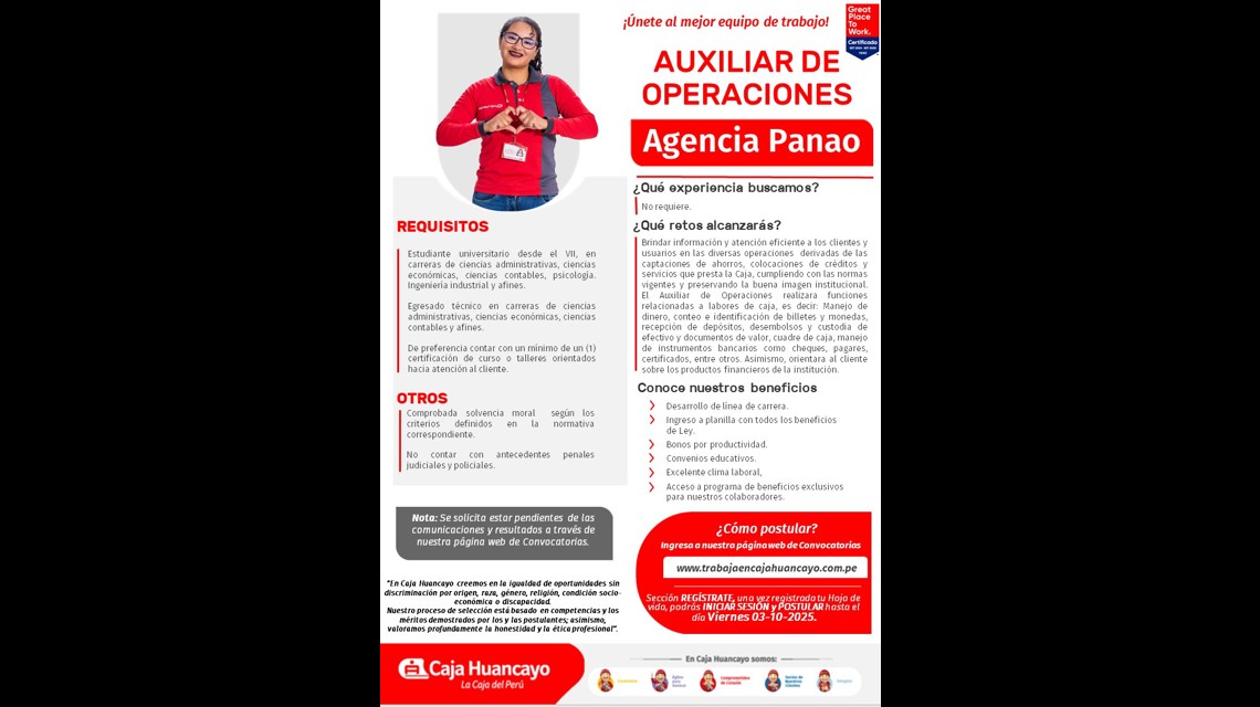 Caja Huancayo, una de las instituciones financieras más reconocidas y sólidas del país, se encuentra en búsqueda de un Auxiliar de Operaciones Agencia Panao. Si eres una persona proactiva, orientada al servicio al cliente y con habilidades de comunicación y persuasión, ¡Esta oportunidad es para ti!