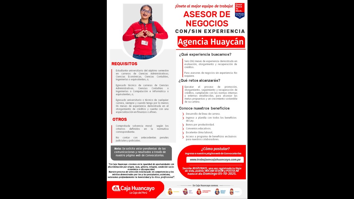 Caja Huancayo ofrece excelentes oportunidades de crecimiento y desarrollo profesional, así como un ambiente de trabajo colaborativo y dinámico. Si te apasiona el mundo de las finanzas y quieres formar parte de una organización líder en el sector, ¡no dudes en postularte! Estamos ansiosos por conocerte y descubrir cómo puedes contribuir a nuestro éxito.