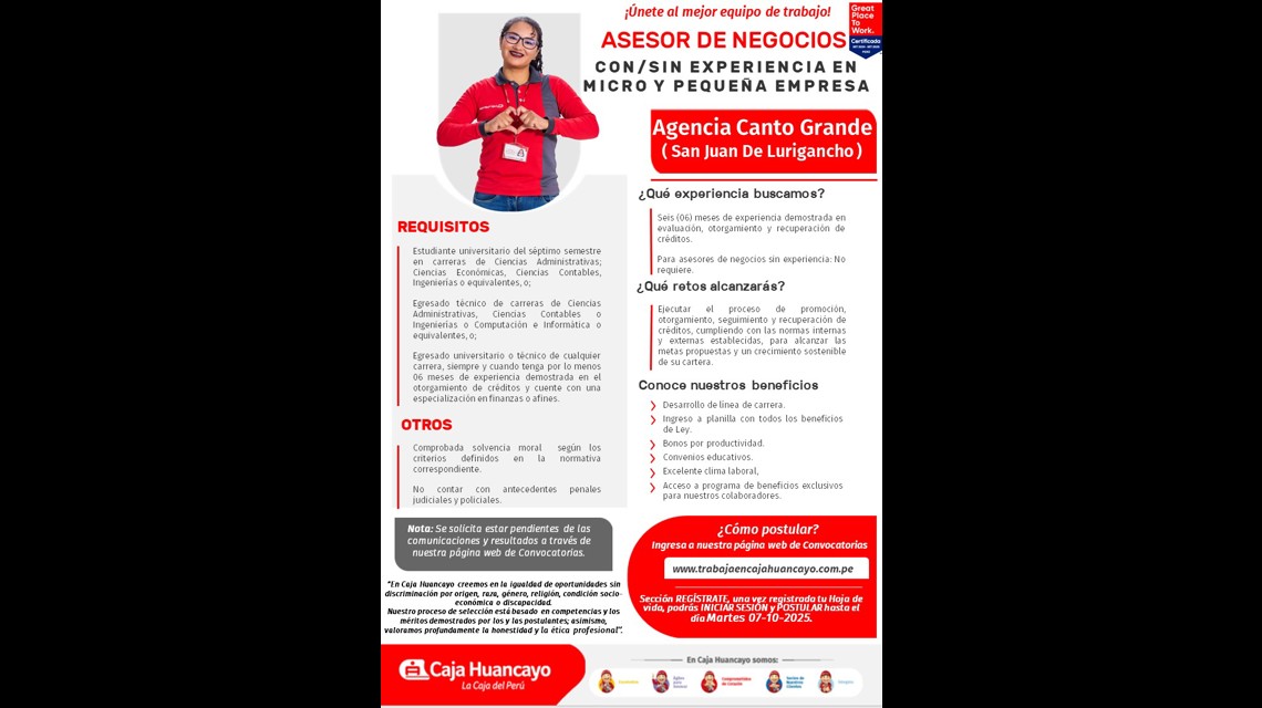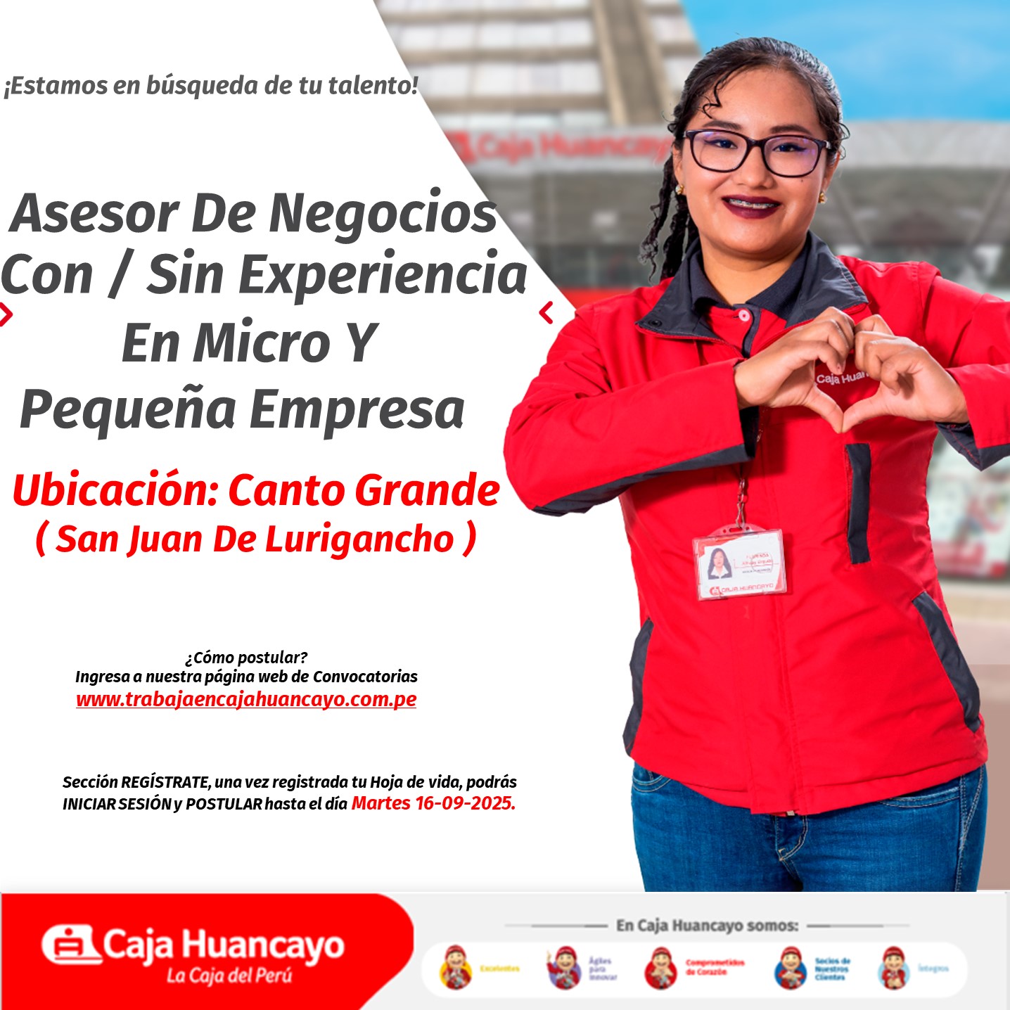 - Estamos en la búsqueda de un talentoso ASESOR DE NEGOCIOS CON/SIN EXPERIENCIA EN MICRO Y PEQUEÑA EMPRESA – UBICACIÓN: CANTO GRANDE (SJL)
