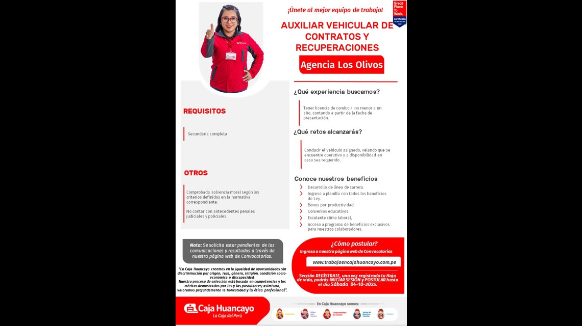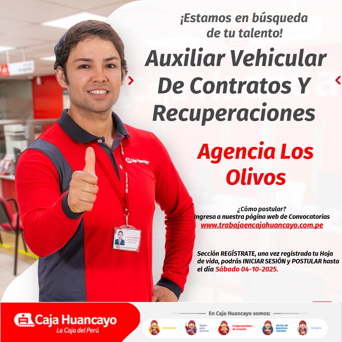 ¡Caja Huancayo está buscando un Auxiliar Vehicular (conductor) para unirse a nuestro equipo , con habilidades en orientación al cliente, orientación al logro, caja, capacidad de análisis, mejora continua, orden y método, y gestión de mercado!