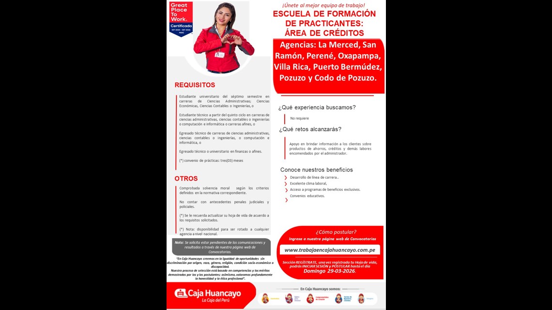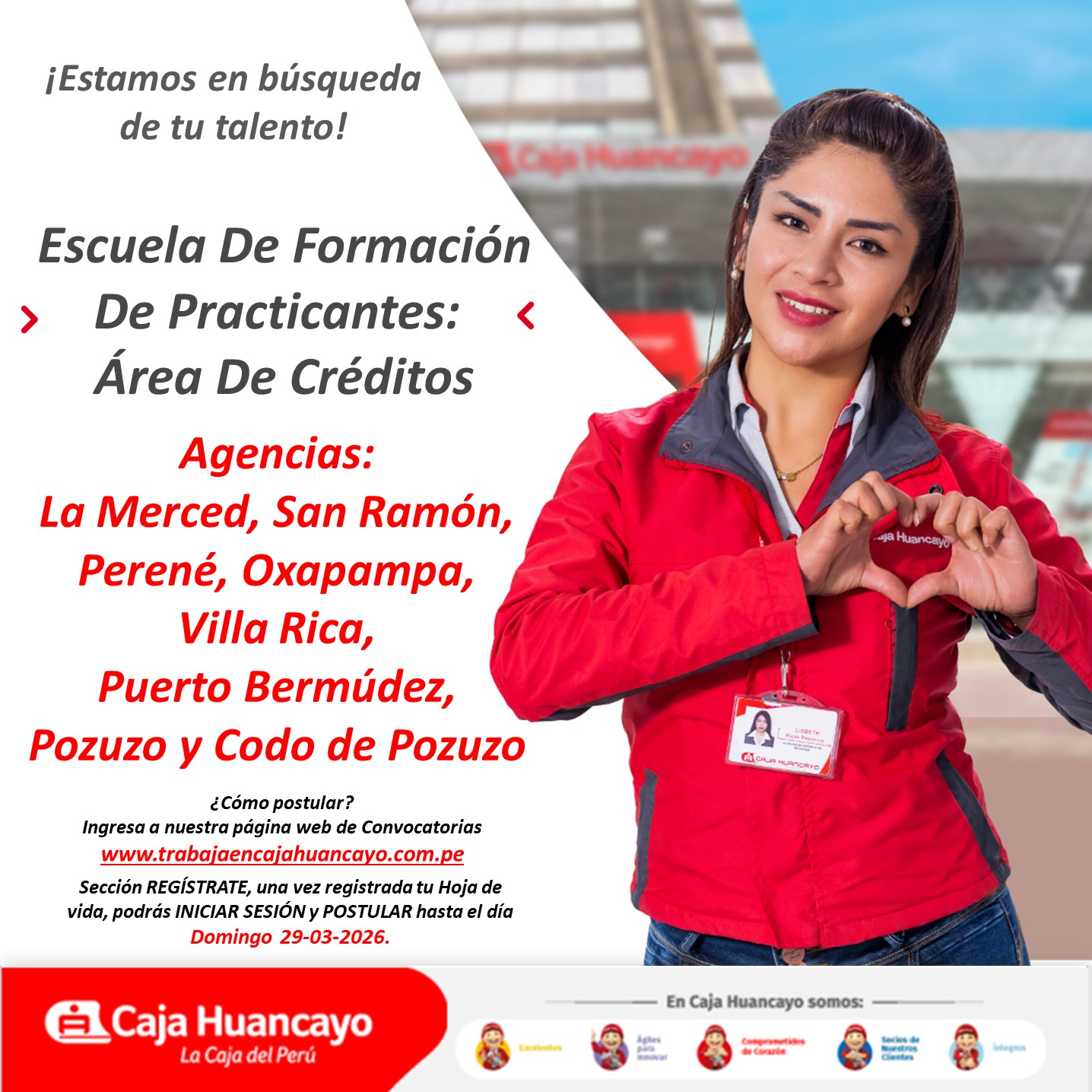 Únete a este gran equipo como: PRACTICANTE ÁREA DE CRÉDITOS - AGENCIAS: VILLA RICA - PUERTO BERMUDEZ