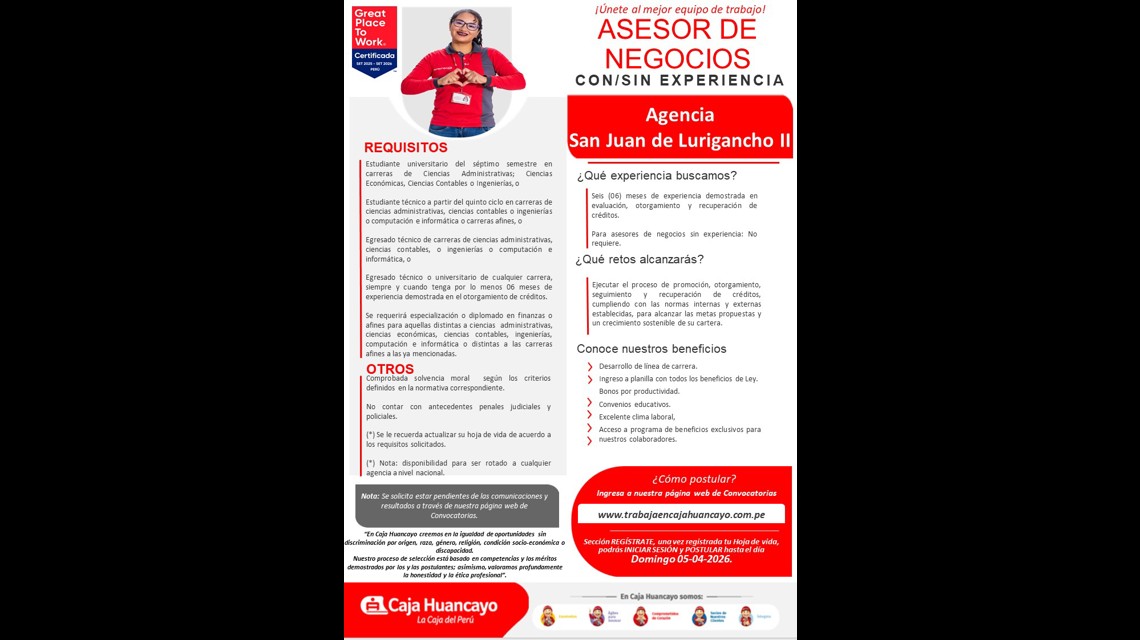 Únete a este gran equipo como: ASESOR DE NEGOCIOS CON/SIN EXPERIENCIA - AGENCIA SAN JUAN DE LURIGANCHO II