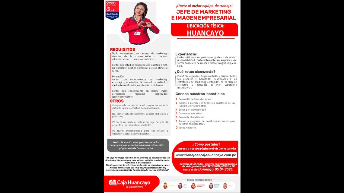 Únete a este gran equipo como: JEFE DE MARKETING E IMAGEN EMPRESARIAL - HUANCAYO