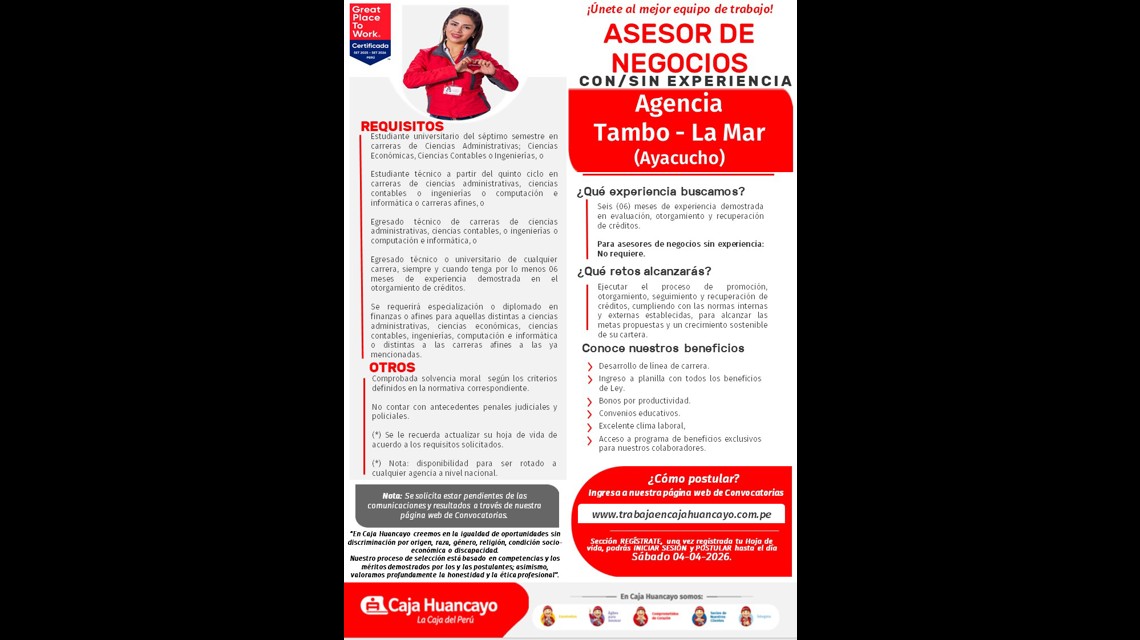 Asesor de Negocios Con/Sin Experiencia Agencia Tambo La Mar (Ayacucho)