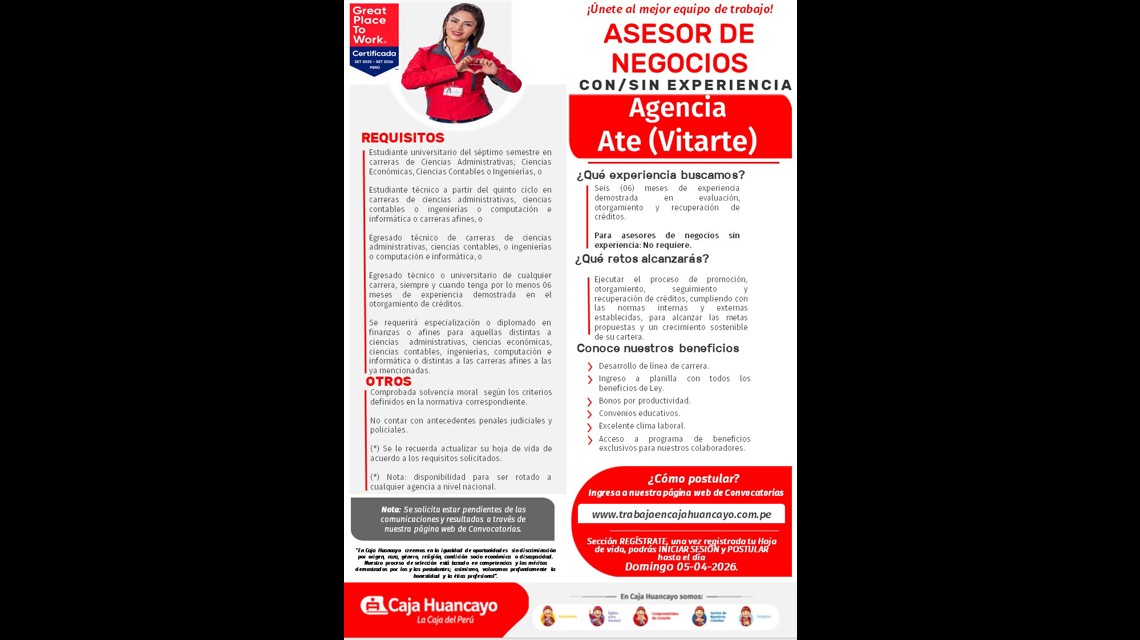 - Para asesores de negocios con experiencia: Seis (06) meses de experiencia demostrada en evaluación, otorgamiento y recuperación de créditos.