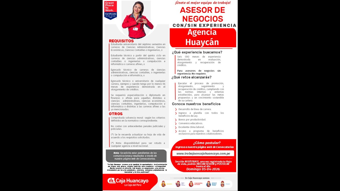 - Para asesores de negocios con experiencia: Seis (06) meses de experiencia demostrada en evaluación, otorgamiento y recuperación de créditos.